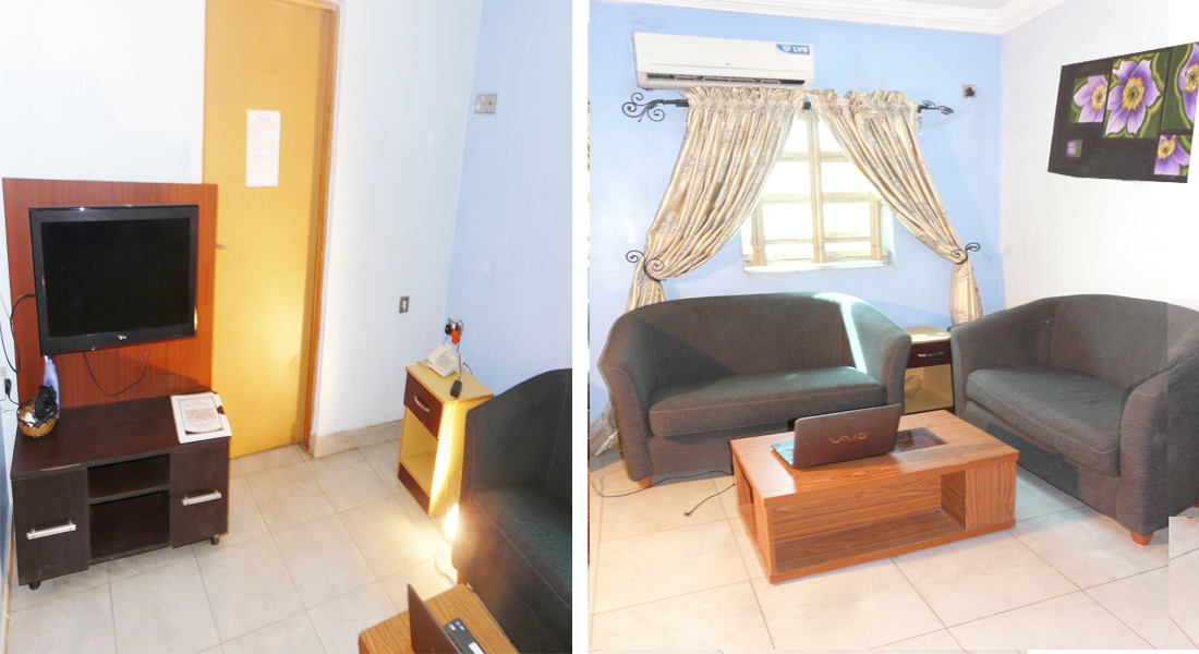 The living room is separated from the bedroom by an extended hallway for privacy and offers a sofa, lounge chair, coffee table, tablet technology .